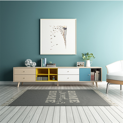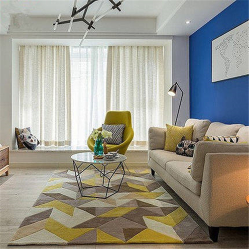 客廳是家里走動十分頻繁的地方,所以在地毯的選擇方面好選擇耐磨、顏色耐臟的地毯。 幾何圖案的的地毯十分適合低矮的茶幾,這樣的組合方式令現(xiàn)代客廳顯得生氣勃勃。不規(guī)則形狀的地毯也可以放在單張椅子下面增加家居質(zhì)感。