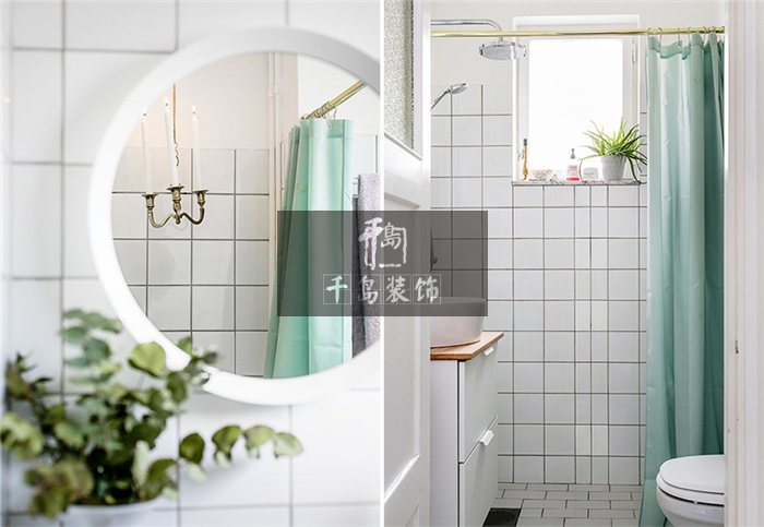 浴室在餐廳與客廳之間,為了避免中間的通道過于單調(diào),屋主在頂部設(shè)計(jì)了一盞鐵藝吊燈,寬大的燈罩搭配鏤空的線條,能夠恰到好處地充盈空間,又不會(huì)顯得過于笨重。純黑的色澤與黑色磚面相互映照,又與白色墻面相互對(duì)比,無處不產(chǎn)生碰撞的美感。