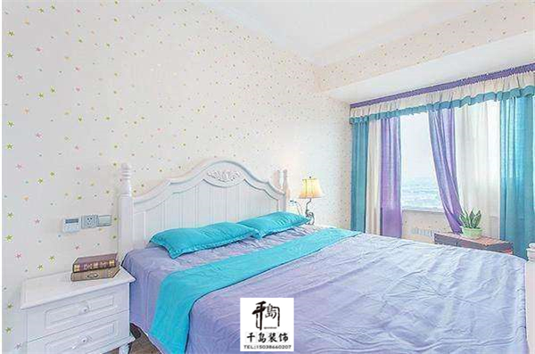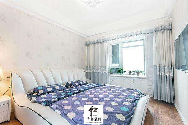 次臥,裝修的很簡單,有一種小清新的感覺,帶著一個飄窗,窗簾和床上四件套的顏色是一樣的。
