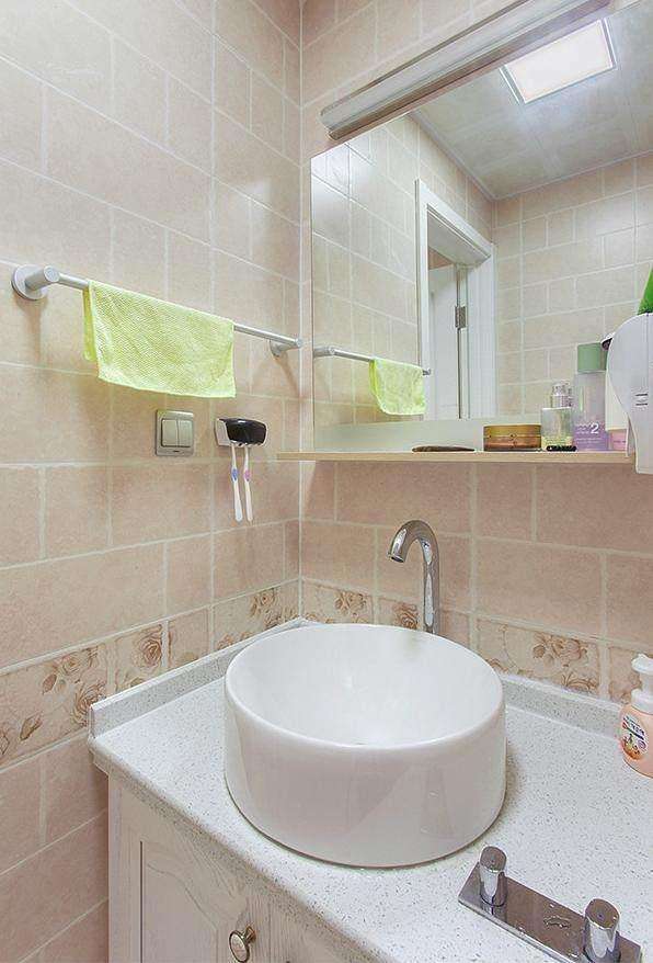 浴室,這種洗手盆不容易讓水濺出來,特別實用,為了干濕分離還買了一個浴簾。