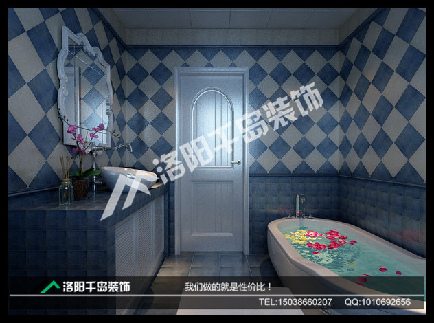 浴室是以藍(lán)色為主,寓意海洋的清新,藍(lán)白菱形的墻壁,讓你仿佛處在上世紀(jì)的歐洲。