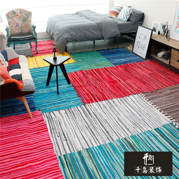 單人公寓小居室或臥室里如果要鋪設(shè)地毯,可以選擇滿鋪的形式,因?yàn)樾】臻g里再分區(qū)就會(huì)顯得頭不是頭,尾不像尾,特別尷尬。用彩色的手工編織棉條滿鋪起來能加寬視覺感,還能讓小屋子看上去更加溫馨。