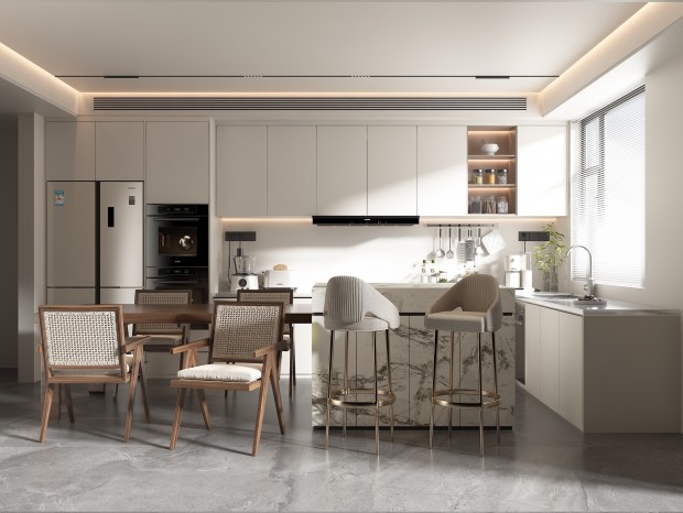 廚衛(wèi)空間是家居中關(guān)注的焦點。選擇大尺寸墻地磚和通縫鋪貼能讓整體效果更大氣,提升裝修檔次。