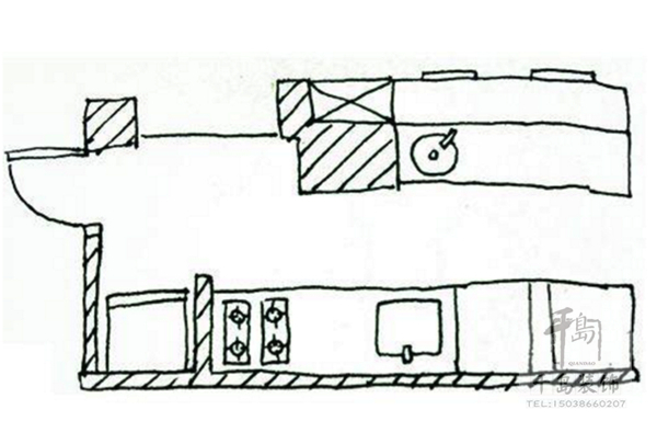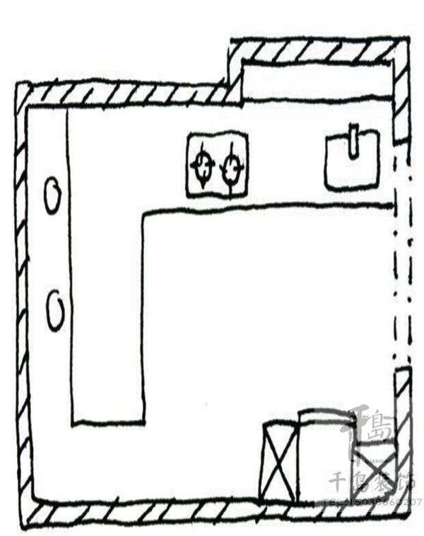廚具主要是沿著墻面一字排開,區(qū)域劃分的重點(diǎn)為冰箱-工作臺(tái)-洗滌區(qū)-處理區(qū)-烹飪區(qū)-用膳區(qū),佳空間長度大約為2公尺。由于空間的限制,櫥柜應(yīng)貼墻布置以適應(yīng)空間的特點(diǎn)和滿足功能的需求,烹飪用具不能過多,對(duì)櫥柜高度要仔細(xì)安置。