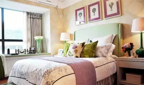 抹茶綠的軟包床搭配薰衣草紫的床品和掛畫(huà),用淺米色墻紙鋪墊,淡淡的花香縈繞臥室,不想睡個(gè)好覺(jué)都難。