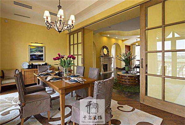 大家都知道黃色是有助于增加食欲的色彩,所以餐廳就更應(yīng)該選擇一些偏黃色的色彩,帶給人暖意融融的氣氛,黑白搭配的吊燈,則能展現(xiàn)美式風(fēng)情,打造餐廳的混搭風(fēng)。